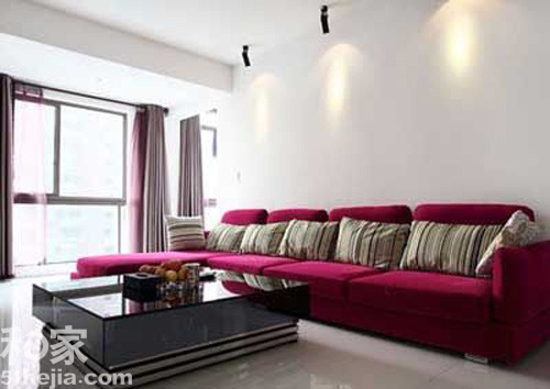 客廳沙發區,玫紅色的沙發頗具時尚感