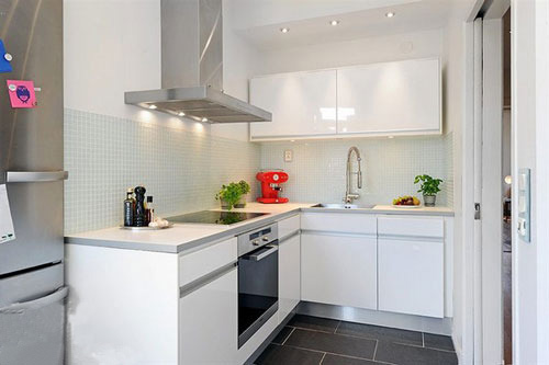 整體廚房裝修效果圖:一字型排列的廚櫃大多為簡單的直線條,橫平豎直的設計風格減少了不必要的裝飾線條,用簡單的直線來強調廚房空間的開闊感。簡約主義的廚房由于其直線型的設計較多,空間感很強,讓人們在其中倍感舒適與清爽。