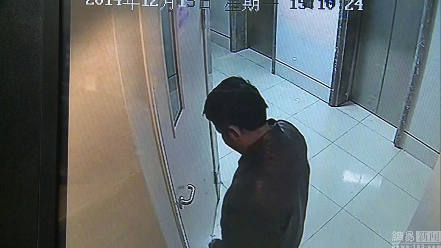 據物業人士介紹,去年12月17日,8號樓的樓宇管家在每天兩次的例行巡樓時,發現整幢大樓有9個樓層的防火門門把手不翼而飛。去年12月19日又發現6個樓層的門把鎖缺失,去年12月26日又有3個樓層的門把手缺失。圖為該男子接受警方調查。