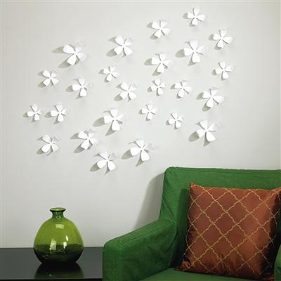 灰白色的牆面上,用純白的花朵裝飾點綴,立即出現了漫天飛舞的感覺,雖然不是雪花,但有著雪花飛舞的即視感。飄飄欲飛的花朵很有立體感,更有強烈的裝飾效果。旁邊的綠色沙發和玻璃瓶裝飾,在純白之中展露勃勃生機。