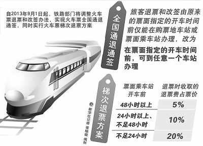 本報北京8月26日電 (記者陸婭楠)記者從中國鐵路總公司獲悉:為進一步方便旅客退票和改簽,自2013年9月1日起,鐵路部門將調整火車票退票和改簽辦法,實現火車票全國通退通簽,同時實行火車票梯次退票方案。