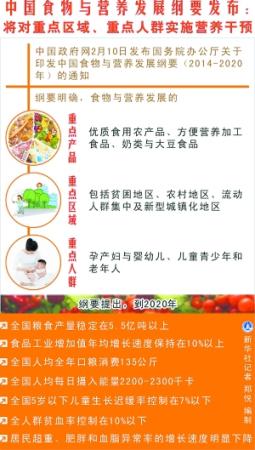 針對我國食物生產還不能適應營養需求,居民營養不足與營養過剩並存,營養與健康知識缺乏等主要問題,為順應經濟社會發展和城鄉居民期待,昨天,國務院辦公廳正式發布《綱要》,這是繼《九十年代中國食物結構改革與發展綱要》、《中國食物與營養發展綱要(2001-2010年)》之後,我國政府制定的第三部關于食物與營養發展的綱領性文件,繪制出至2020年我國食物與營養發展的新藍圖。