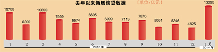 交行金融研究中心認為,1月信貸激增一方面源于年初各行信貸計劃較為充裕,一月信貸投放動力較強;另一方面,2013年年末信貸約束較緊,部分貸款也順延至2014年1月發放。