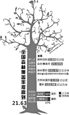 國家林業局25日公布了第八次全國森林資源清查成果。清查顯示,全國森林面積2.08億公頃,森林覆蓋率達21.63%,森林蓄積151.37億立方米。其中,人工林面積0.69億公頃,蓄積24.83億立方米。