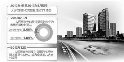 隨著中國的日益開放和人民幣國際化步伐的不斷推進,人民幣作為支付貨幣的需求正在日趨加大。環球銀行金融電信協會(SWIFT)1月23日公布的報告顯示,2013年11月和12月,人民幣連續兩個月榮登世界十大支付貨幣(按支付價值計算)排行榜。2013年12月,人民幣在全球支付貨幣的市場份額上升到1.12%,成為全球第八大支付貨幣。在2012年1月至2013年8月期間,人民幣的外匯交易量增加了113%,在全球榜單上超越瑞典克朗、韓元和俄羅斯盧布。在過去3年中,人民幣已經跨越22國貨幣,逐步邁向成為國際貨幣之路。人民幣作為支付貨幣使用主要集中在香港地區,佔比達74%。同時,英國、新加坡和中國臺灣的人民幣支付份額正在迅速增加。