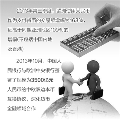 SWIFT數據還顯示,2013年第三季度,歐洲使用人民幣作為支付貨幣的交易額增幅高達163%,遠高于同期亞洲地區109%的增幅(不包括中國內地及香港)。這表明歐洲使用人民幣作為支付手段的進程正在不斷加快。