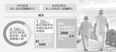 到2013年底,新農保、城居保覆蓋人數達到4.98 億人,其中按月領取養老金的城鄉老年居民1.38億,這些老人的月人均養老金僅為81元,全年不到1000元。