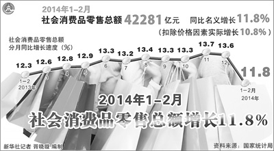 本報北京3月13日電 (記者朱劍紅)國家統計局今天發布數據,1—2月份,社會消費品零售總額42281億元,同比名義增長11.8%(扣除價格因素實際增長10.8%)。其中,限額以上單位消費品零售額20133億元,增長9.5%。
