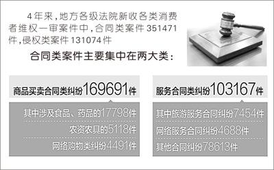 統計數據顯示,人民法院每年審理消費者維權民事案件數量從2010年的112779件上升到2013年的128198件,案件類型包括合同糾紛與侵權糾紛兩大類20余種。