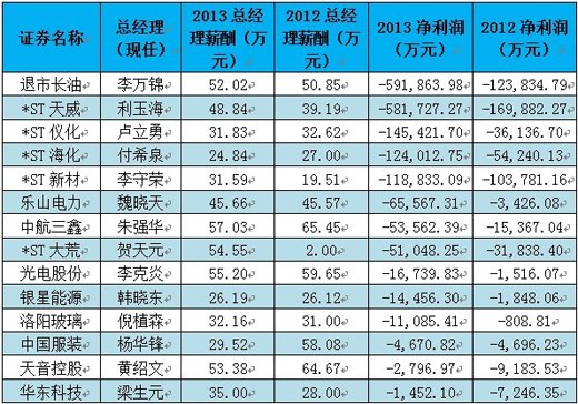除了薪酬數目,年薪波幅也值得關注。數據顯示,較去年漲幅在100%以上的有12家企業,其中*ST大荒總經理薪酬漲幅竟高達2627.50%,但公司凈利潤則從2012年虧損31,838.40萬元,上升到2013年虧損51,048.25萬元。業績持續下滑,但總經理薪水不降反升。據悉,*ST大荒控股的黑龍江省北大荒米業集團有限公司已連續多年巨額虧損,上市公司因此負累甚重。今年一季度,*ST大荒已轉讓米業公司的全部股權,甩掉包袱後,能否“摘星脫帽”有待關注。