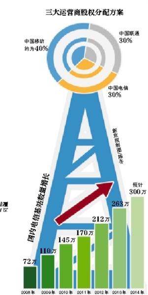 據了解,目前暫定的鐵塔公司中,三家公司股權分配方案是:中國移動將佔有最大份額,約為40%,中國聯通和中國電信兩家各佔30%。不過也有媒體採訪三大運營商,稱目前尚沒有達成任何最終協議。