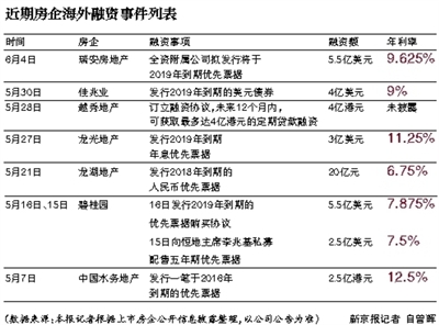 6月4日,瑞安宣布將發債5.5億美元,這筆2019年到期的債券年息達9.625%,利息僅低于同是5月發債的小開發商中國水務地產(12.5%)和龍光地產(11.25%),凸顯出開發商對資金的饑渴。