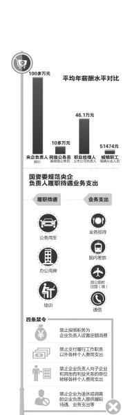 據悉,針對目前不同央企的福利項目和待遇水平存在較大差異的情況,改革方案還明確提出,央企負責人應按照國家有關規定參加基本養老保險和基本醫療保險,建立補充養老保險(年金)、補充醫療保險和繳存住房公積金等,並納入統一薪酬體係統籌管理。同時,規定中央管理企業負責人不得在企業領取國家規定之外的任何其他福利性貨幣收入。