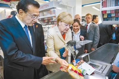 李克強和默克爾一起逛超市,排隊等候結賬時,李克強正要付款,默克爾堅持由她來結賬。