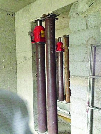 業主小徐今年4月在新城香溢瀾橋買房,他買房時每平米房價是6400多元,100多平米的房子共花去80萬元左右。小徐稱,一次偶然的機會,他驚訝地發現,房子的大梁用千斤頂撐著,工人正在旁邊重新用混凝土施工。同時,有的承重牆內鋼筋裸露在外,有的地方還有大量鋼管。另外,部分牆面的水泥被敲掉。