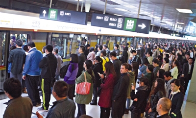 昨日晚高峰,地鐵呼家樓站,大量乘客等候上車。