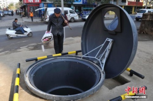 11月6日,山西太原,民眾圍觀新建成的地埋式垃圾桶。該垃圾桶直徑1.9米、高2.8米,可容納垃圾近10立方米,其獨特的造型引得不少民眾上前圍觀。武俊傑 攝