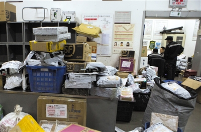 昨日,東城一快遞公司門店內,擺滿了各種快遞。其中很多包裝盒都是一次性使用。 新京報記者 高瑋 攝