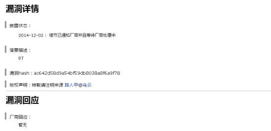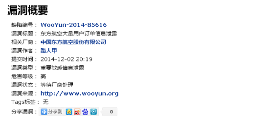 12月2日20:19,烏雲白帽子“路人甲”提交了一個關于“東方航空大量用戶訂單信息泄露”的漏洞,不過目前,漏洞狀態仍然是“等待廠商處理”。