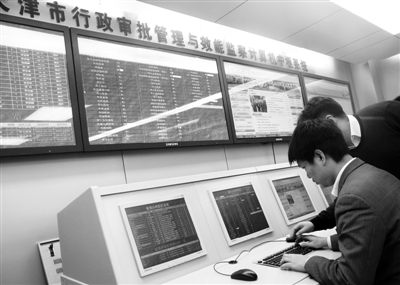 天津市行政審批中心後臺工作人員在對各項目審批進展進行監測。