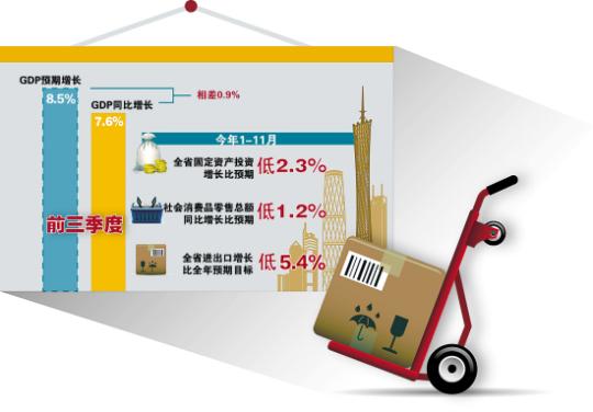 而省發改委的報告則指出,全省經濟調結構穩增長的任務依然艱巨。前三季度,廣東GDP同比增長7.6%,與預期相差0.9個百分點。除此之外,今年1-11月,全省投資、消費、進出口增速均低于預期目標。