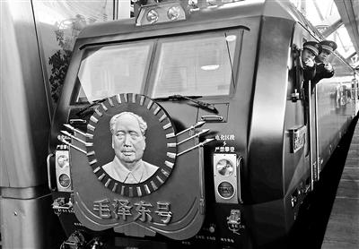 昨天14點20分,北京站第一站臺上,煥然一新的“毛澤東號”機車戎裝待發。通身紅黑相間的外衣讓其在站臺上格外顯眼。車身兩側“和諧HXD3D1893”和車頭的毛主席金色徽像都向人們昭示著它的與眾不同。