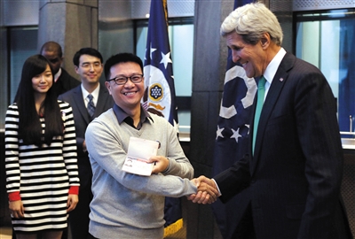 去年11月12日,美國駐華大使館簽證處,美國國務卿克里為首批獲得最長10年美國簽證的中國申請人頒發新簽證。新華社發