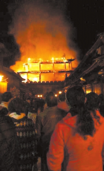古城客棧工作人員楊先生介紹,此次大火燒毀的主要是拱辰樓樓頂的木質結構,現在只剩框架。他說,由于撲救及時,古城大部分建築、景點並未受影響,昨天還有許多遊客在古城里觀光。