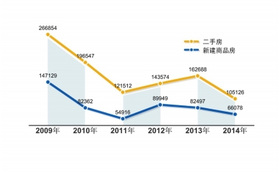 根據中原地產市場研究部統計數據顯示,2014年北京二手房住宅網簽套數為105126套,從2008年下半年全面網簽以來,去年二手房成交量是連續6年來歷史最低的一年,相比2013年同比下調幅度達到了35.4%。從單月成交情況看,2014年前10個月連續出現了低于1萬套成交量的歷史最低;11月受到一係列刺激政策的影響,但成交量也僅在1.1萬套左右;12月整體市場成交繼續復蘇,全月網簽二手房達到14671套,比11月上漲了29.6%。