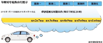 2015年1月11日至4月10日,北京五環路以內(不含五環主路)的機動車,限行車牌尾號分別為:周一2和7、周二3和8、周三4和9、周四5和0、周五1和6。限行時間為周一至周五7時至20時。