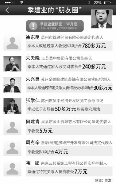 起訴書稱,2005年5月至2006年3月,季建業利用擔任揚州市委書記職務上的便利,接受祝梅的請托,為南京三邦係統工程有限公司承攬蘇北人民醫院空調設備供應項目提供幫助。2006年12月,季建業通過祝梅在南京三邦係統工程有限公司,收受該公司實際控制人韋斌給予的人民幣7萬元。