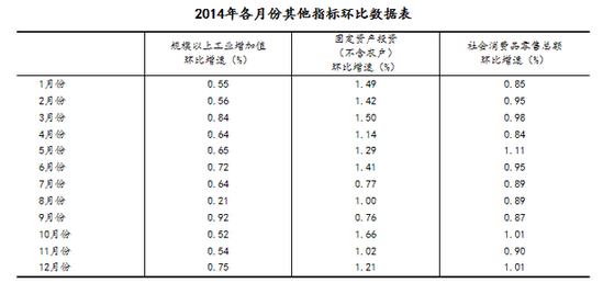 (2)根據季節調整模型自動修正結果,對近一年來各期國內生產總值、規模以上工業增加值、固定資產投資(不含農戶)、社會消費品零售總額環比增速進行修訂。修訂結果及2014年四季度GDP環比數據、2014年12月份其他指標環比數據如下: