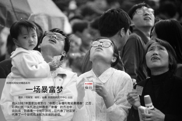 自從1987年國家批準發行“中國社會福利有獎募捐券”之後,彩民們就一頭扎進這種尋求“幸福”的方法中,說到底,彩票是一個博彩遊戲,它代表了財富夢,代表了一個最低成本成為富翁的途徑。圖為1997年,山西太原市千峰工貿彩票發售現場。一家祖孫三代手握彩票正在對照中獎圖標。攝影/程耀寶 編輯/翁倩