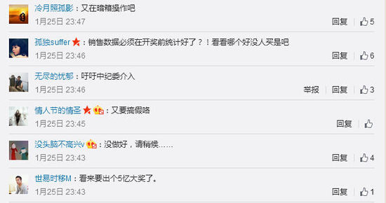 到今晨零點30分,中彩網上述兩條微博評論已共有1100多條,網友們紛紛質疑雙色球造假,懷疑中獎人員是中福彩內部人員。