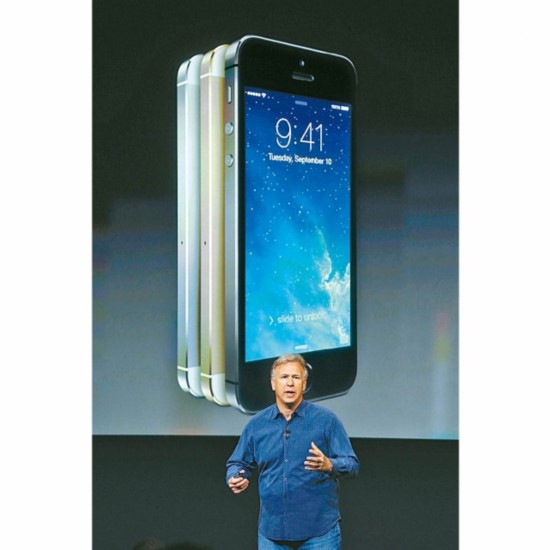 同時推出的iPhone 5S,蘋果形容為“我們所創造的最具前瞻性手機”,“冀成智能手機的黃金標準”,提供銀色、金色和“太空灰色”機身供選擇。iPhone 5S被視為iPhone 5的升級版,採用A7處理器,比A6快一倍,是2007年第一代的40倍。iPhone 5S配備新拍攝係統,全新安全係統Touch,利用home按鈕的感應器以指紋解鎖。