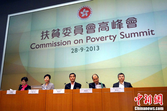 9月28日,香港特區行政長官梁振英主持扶貧委員會高峰會,討論香港的貧窮問題及未來路向。圖為行政長官梁振英(中)、政務司司長暨扶貧委員會主席林鄭月娥、勞工及福利局局長張建宗等會後出席記者會。(洪少葵 攝)