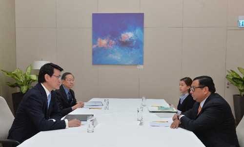 香港特別行政區行政長官辦公室主任邱騰華(左一)及保安局局長黎棟國(左二)今日(十一月十九日)與菲律賓內閣部長Jose Rene Almendras(右一)舉行高層會議,就馬尼拉人質事件受害者及家屬的四項要求進行商討。圖自港府網站