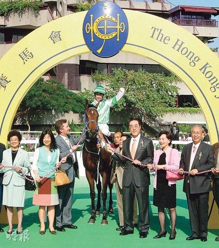 許仕仁(右一)熱愛養馬,圖為2006年時任政務司長的他,于當年元旦賽馬日與時任財政司長唐英年(右三)一起拉頭馬。(明報資料圖片)