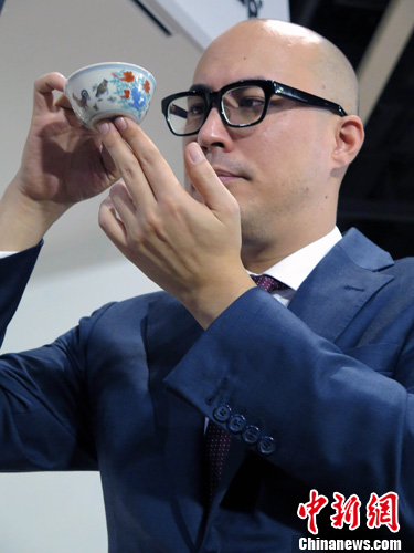 4月8日,在香港蘇富比春拍上,玫茵堂珍藏明成化鬥彩雞缸杯以落槌價2.5億元(港幣,下同)、總成交價2.8124億元拍出,刷新中國瓷器世界拍賣紀錄。圖為拍賣後,蘇富比亞洲區副主席及中國瓷器及工藝品部國際主管仇國仕展示拍品。中新社發 賈思玉 攝