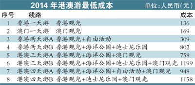 據了解,港澳遊採取年度合約報價,因此2014年全年港澳遊平日(非公眾假期或周末)成本一般不會有大的變動。黃金周、暑假等旅遊旺季旅遊協會將根據市場供求情況的變化適時調整公示。需要說明的是,此成本按照港澳遊典型線路產品接待和服務的最低費用進行核算,市面上港澳遊最終售價會高于此成本。