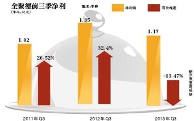 全聚德表示,受市場環境影響,公司餐飲企業公務宴請和高端接待業務有所減少,預計2013年度凈利潤為9123.25萬元至1.37億元,同比下滑40%-10%。