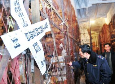12月19日,成都工商、公安等部門聯合執法,封存凍庫里沒有檢驗手續的凍肉。