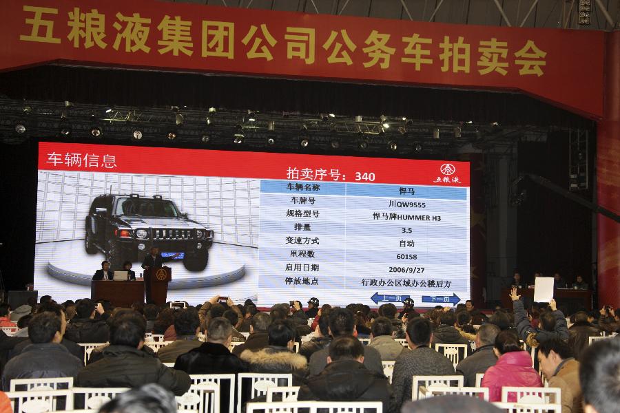 新華社照片,宜賓(四川),2014年1月14日 五糧液集團公務車拍賣結束 成交額超3000萬元 1月14日,在五糧液公務車拍賣會上,競拍者在競拍一輛悍馬車。當日,為期4天的五糧液集團公務車拍賣活動結束,拍賣共成交車輛324臺,成交額3003萬元。1月11日,五糧液開始公開拍賣公務用車,被拍賣的公車包括悍馬、沃爾沃、奧迪等豪華車。新華社發(曾朗)
