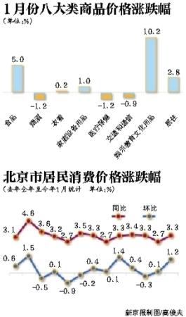 新京報訊 (記者蔣彥鑫)北京市統計局、國家統計局北京調查總隊昨日發布數據顯示,今年1月,北京CPI同比上漲3.3%,環比上漲1.2%。受節日因素影響,食品價格大漲5%,其中,鮮果價格上漲30.3%。