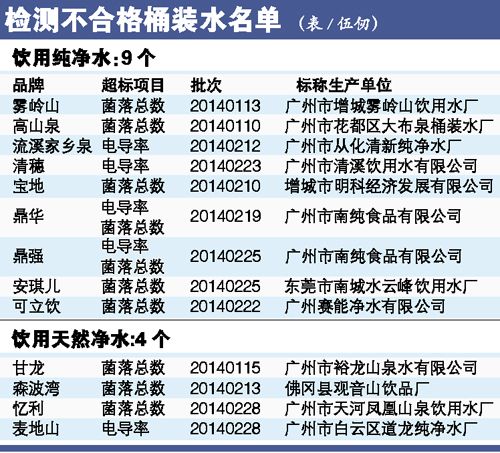 13批次不合格的桶裝飲用水中,有11批次被發現菌落總數超標,其中廣州市裕龍山泉水有限公司生產的甘龍牌飲用天然凈水,菌落超標高達3100倍。其余菌落超標的桶裝水,超標范圍也在6倍~29倍之間。