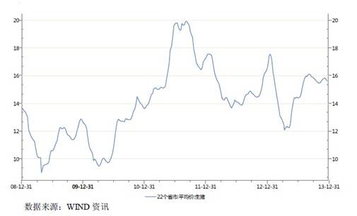 2008年-2013年,全國22省市生豬平均價格呈周期性波動圖(單位:元/公斤):
