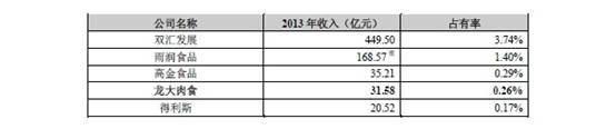 龍大肉食招股書顯示,2013年我國規模以上屠宰及肉類加工企業實現營業收入為12013.21億元,龍大食品的市場佔有率僅為0.26%。位列同行業上市公司倒數第二,僅高于同省的得利斯。