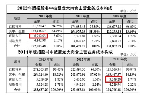 2012年龍大肉食首版招股書中,直接人工費用高于職工薪酬總額曾引起媒體普遍質疑。筆者發現,在2014版的招股書中,同樣是2011年的直接人工費用項目,前後版本差額達3592.83萬元。前版2011年龍大肉食直接人工費用6942.03萬元,而後版此項費用驟減為3349.20萬元。
