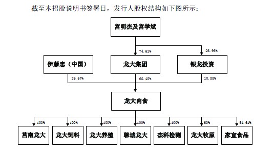 宮明傑和宮學斌父子,合計持有龍大集團74.51%的股權,同時合計持有銀龍投資26.96%的股權,間接控制龍大肉食62.45%股權,宮明傑、宮學斌為公司實際控制人。龍大肉食坦言,雖然公司建立了《關聯交易制度》、《獨立董事制度》等,但控股股東和實際控制人仍可能利用其控制地位,通過行使表決權等方式對公司的人事任免、經營決策等進行不當控制,從而損害公司及公司中小股東的利益。