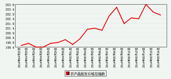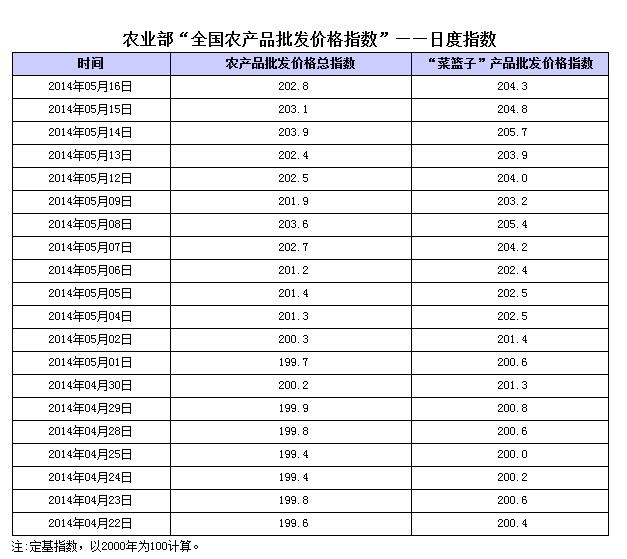 農業部5月16日公布“全國農產品批發市場信息網”監測報告。報告顯示5月16日,農產品批發價格總指數是202.8(以2000 年為100),“菜籃子”產品批發價格指數是204.3(以2000年為100)。